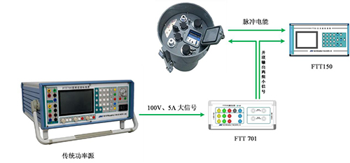 利用厂家自有的传统功率源或继保仪,施加常规的大信号电量,经过FTT701电量变送器转换成一二次融合需要的小信号,小信号并联输出2组,一组提供一二次融合终端进行采样,一组提供给小信号多功能表进行计算,这样就可以利用小信号多功能表采样和计算所得的数据作为标准参考对配电终端调试、校准、测试。