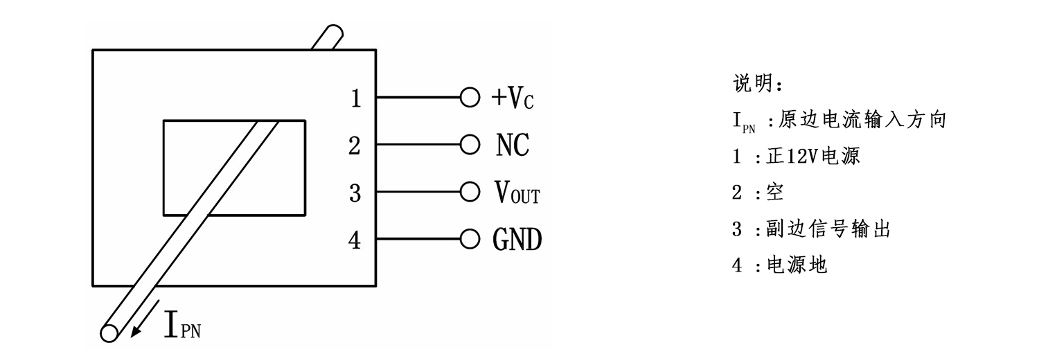 该传感器采用直测式霍尔检测原理工作。原边电流产生的磁通量聚集在磁电路中,并由霍尔器件检测出霍尔电压信号,经过放大器放大,该电压信号精准的反应原边电流。